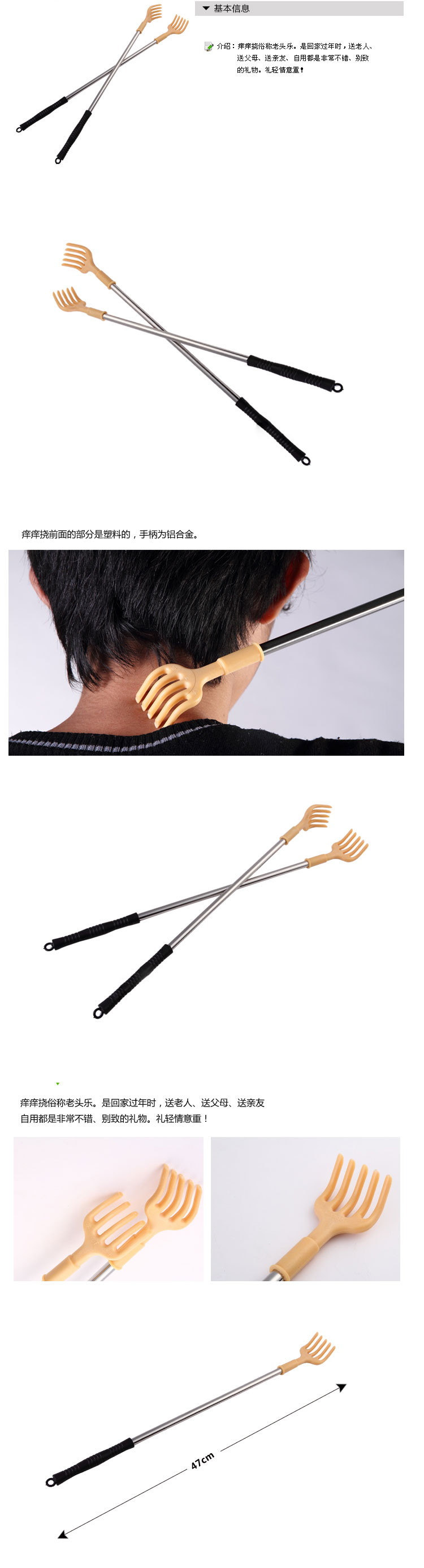 钢管抓痒扒——送给父母的好礼物父母对我们的爱,是我们倾尽一生都无法偿还的,现在你长大成人了,你是不是想为自己的父母做点什么,感谢他们对我们多年以来的养育之恩呢?但是,选择什么方式最好呢?选择什么礼物送给他们最好呢?脑白金?黄金搭档?不,这些礼物我们的父母都不需要,他们需要的仅仅是那么一点点孝心,那么,钢管抓痒扒是你献给父母最好的礼物。这款抓痒扒的把手是由不锈钢制作而成,挠手是由特殊的塑料制作而成,以防止造成皮肤过敏,而且,质量也很轻,所以,老年人使用起来非常方便,有人会问,给父母送礼物,怎么能送价格这门低廉的礼物呢?这你就不懂了吧,俗话常说,千里送鹅毛,礼轻情意重吗,这款抓痒扒虽然价格低廉,但是它体现出了你对父母浓浓的爱意。